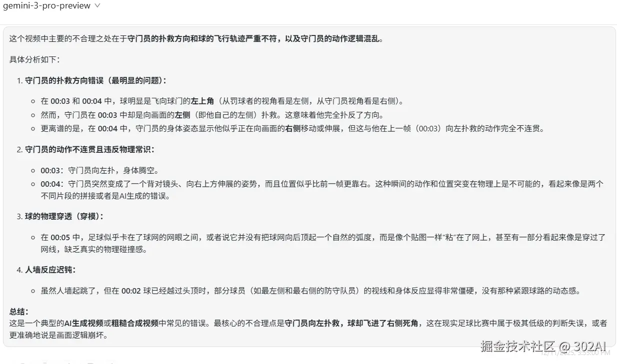附 Gemini 3 Pro ****的回答,起码明确指出了穿模漏洞和人物运动轨迹违反物理常识的问题。