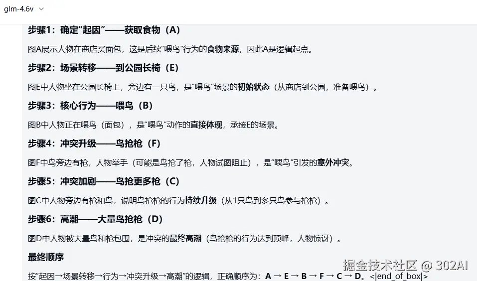 GLM-4.6V 误读了图F所示的鸟持枪的意图, 偏离漫画原本逻辑导致排序答案错误。