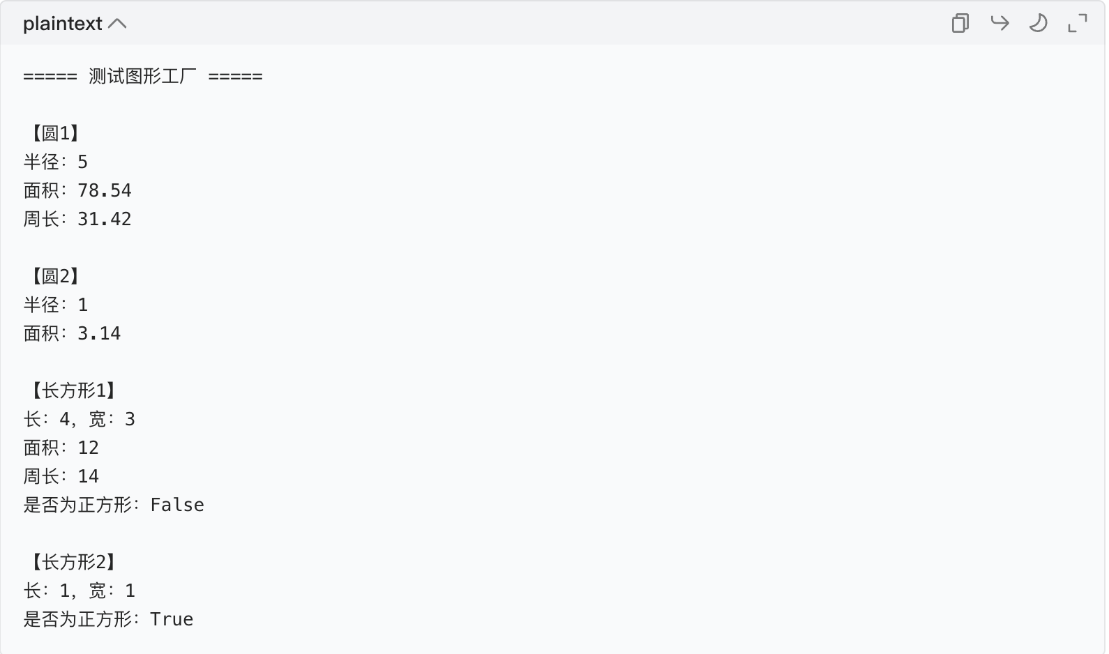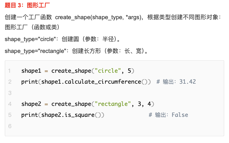 *args:可变长度参数,能接收任意数量的位置参数,打包成元组(比如传入 5,args=(5,);传入 4,5,args=(4,5));shape_type.lower():统一转换为小写,避免用户传入 "Circle""RECTANGLE" 等大小写混合的类型导致识别失败;- 参数校验:避免传入过多参数(比如创建圆时传入 2 个参数)导致错误。