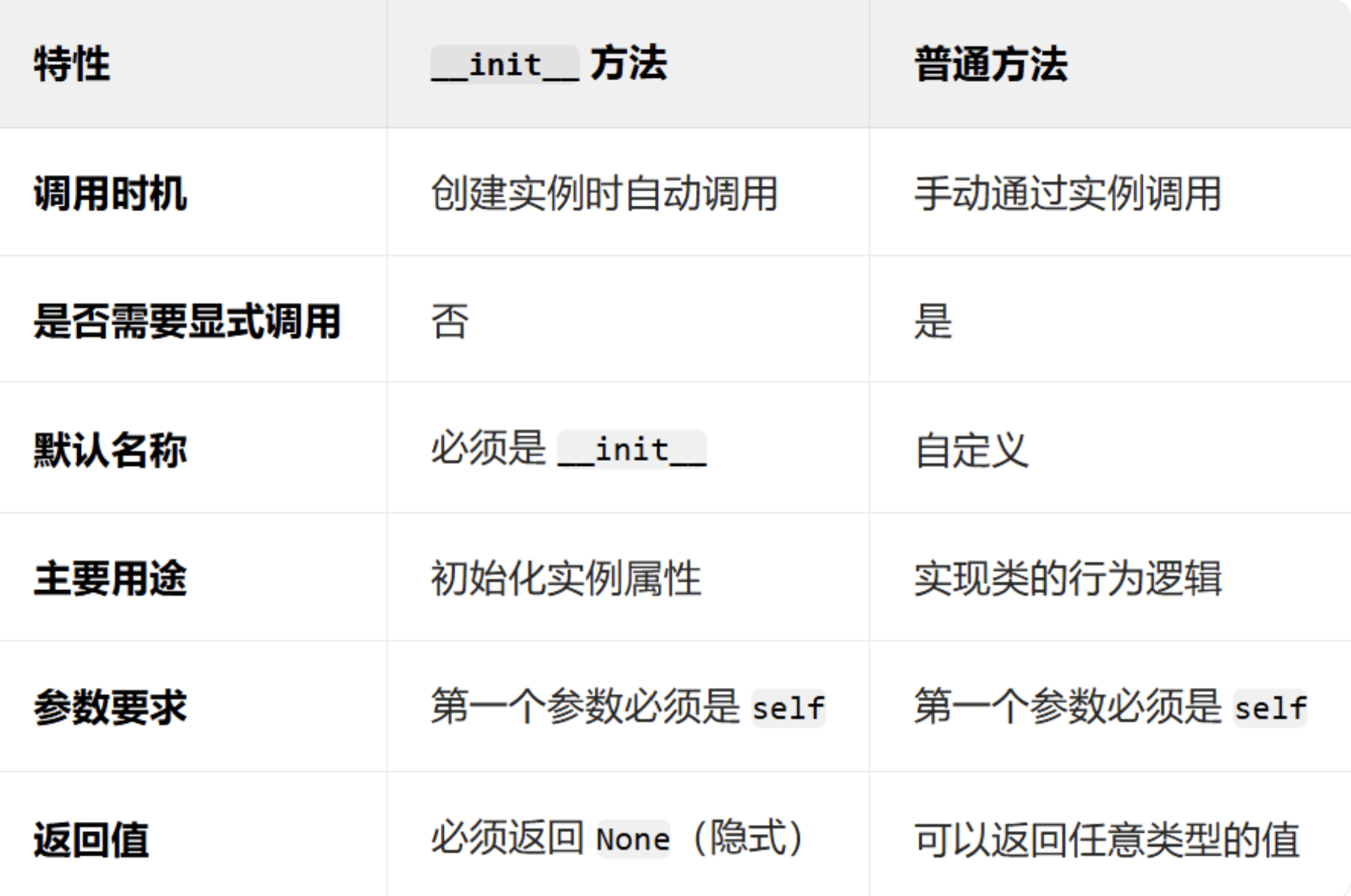 普通方法是类里定义的 "函数",用来描述对象的行为(比如小狗叫、跑),必须通过 "对象。方法名 ()" 调用,而且方法的第一个参数必须是self(和__init__一样,self代表当前对象)。