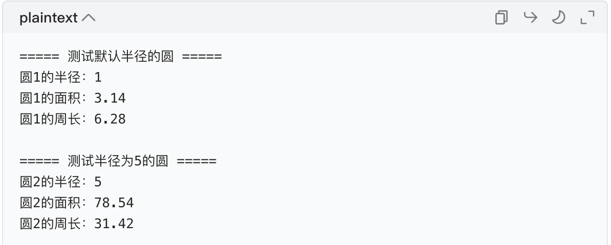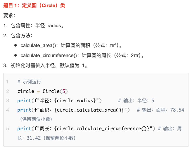 print("\n【异常测试1】", e) # 输出:创建圆只需传入1个参数(半径)!