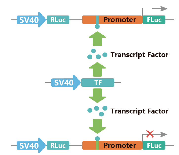 5、验证特定转录因子同其调控序列的作用:将该序列(通常为启动子区域)插入报告基因载体,同时在实验细胞中共转其转录因子,可分析转录因子是否提高荧光素酶活性。