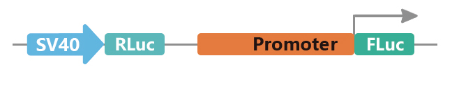 基于荧光素酶(luciferase)的发光原理,科学家发明了双荧光素酶报告基因检测系统。该系统包括萤火虫荧光素酶(Firefly luciferase)和海肾荧光素酶(Renilla luciferase)。两者可催化各自的底物发生氧化作用产生生物荧光,产生的荧光数值大小即表示了两种酶的表达量多少。利用荧光素酶与底物结合发生化学发光反应的特性,把感兴趣的基因转录的调控元件克隆在萤火虫荧光素酶基因的上/下游,构建成荧光素酶报告质粒。然后转染细胞,经适当刺激或处理后裂解细胞,测定荧光素酶活性。通过荧光素酶活性的高低判断刺激前后或不同刺激对感兴趣的调控元件的影响。