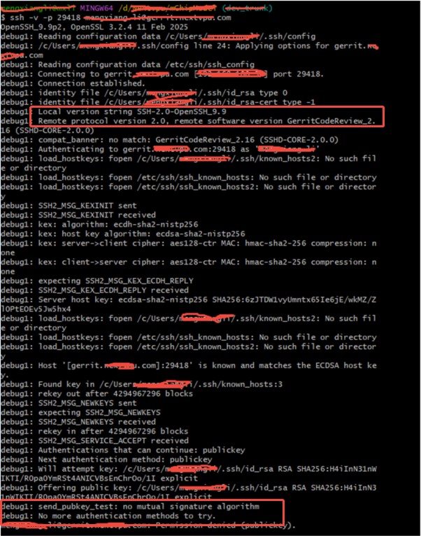 表示客户端和服务器在支持的签名算法上不匹配,服务器可能不支持客户端提供的RSA密钥类型(尤其是如果服务器是较旧的系统,我的ssh客户端OpenSSH9.9默认禁用了不安全的ssh-rsa签名算法,Gerrit服务器GerritCodeReview_2.16只支持较旧的ssh-rsa签名算法还未更新支持更安全的算法,导致客户端和服务器之间没有共同支持的签名算法,因此认证失败。注:这是安全策略不兼容的问题而不是密钥无效问题,所以只在我更新了客户端版本之后这个问题才出现)