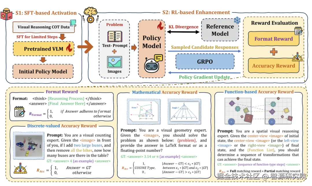 基于这一需求,智源研究院具身多模态大模型研究中心联合北京大学、中国科学院自动化研究所等合作单位,在 RoboBrain 2.0 训练管线中引入了一种创新的两阶段强化学习后训练框架 Reason-RFT 。它并非一项"单点算法",而是 RoboBrain 2.0 后训练阶段的核心推理增强模块,旨在从根本上提升 RoboBrain 系列 VLM 在空间推理、操作规划等任务上的泛化能力。