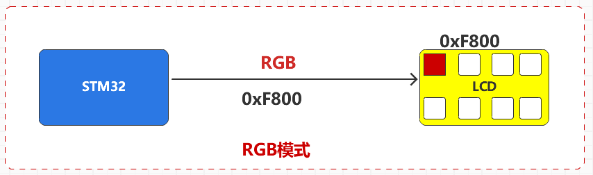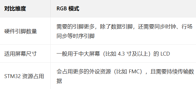- RGB 模式:是一种同步的数据流传输,STM32 会按照屏幕要求的像素时钟,持续的向屏幕传输每一个像素的 RGB 数据,屏幕会实时的把接收到的数据显示出来,这种模式的延迟很低,适合显示动态的、高速变化的内容,比如视频。