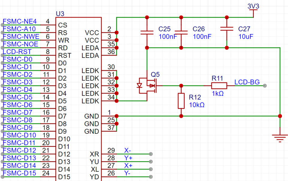 - LEDK是背光亮度控制引脚。通过LCD-BG(PB0)来驱动MOS管Q5的导通电流。可以通过给LCD-BG输出PWM波来控制背光的亮度。占空比越大,背光就会越亮。