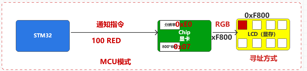 - MCU 模式:也叫 8080 并行接口模式,这种模式下,LCD 屏幕自身带有显存和显示控制器,STM32 只需要通过并行接口,把需要显示的数据写入到屏幕的显存中,之后的显示时序、数据的读取和屏幕刷新,都是由屏幕自己的控制器来完成的。