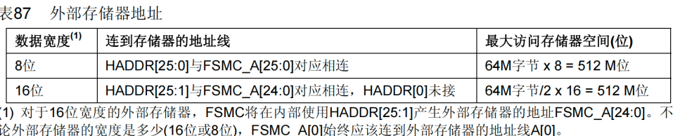 注意:当使用16位宽的外部存储器时,用HADDR[25:1]表示外部的FSMC_A[24:0],内部地址相当于左移了1位,所以计算地址的时候要注意。