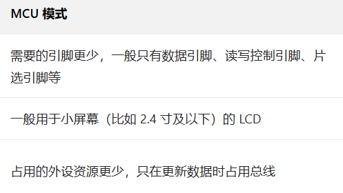- MCU 模式 :是一种异步的传输,STM32 只在需要更新显示内容的时候,才会把数据写入到屏幕的显存,写入完成之后,STM32 就可以去处理其他的任务,屏幕会从自己的显存中读取数据来完成显示,这种模式下,STM32 的资源占用会更低。