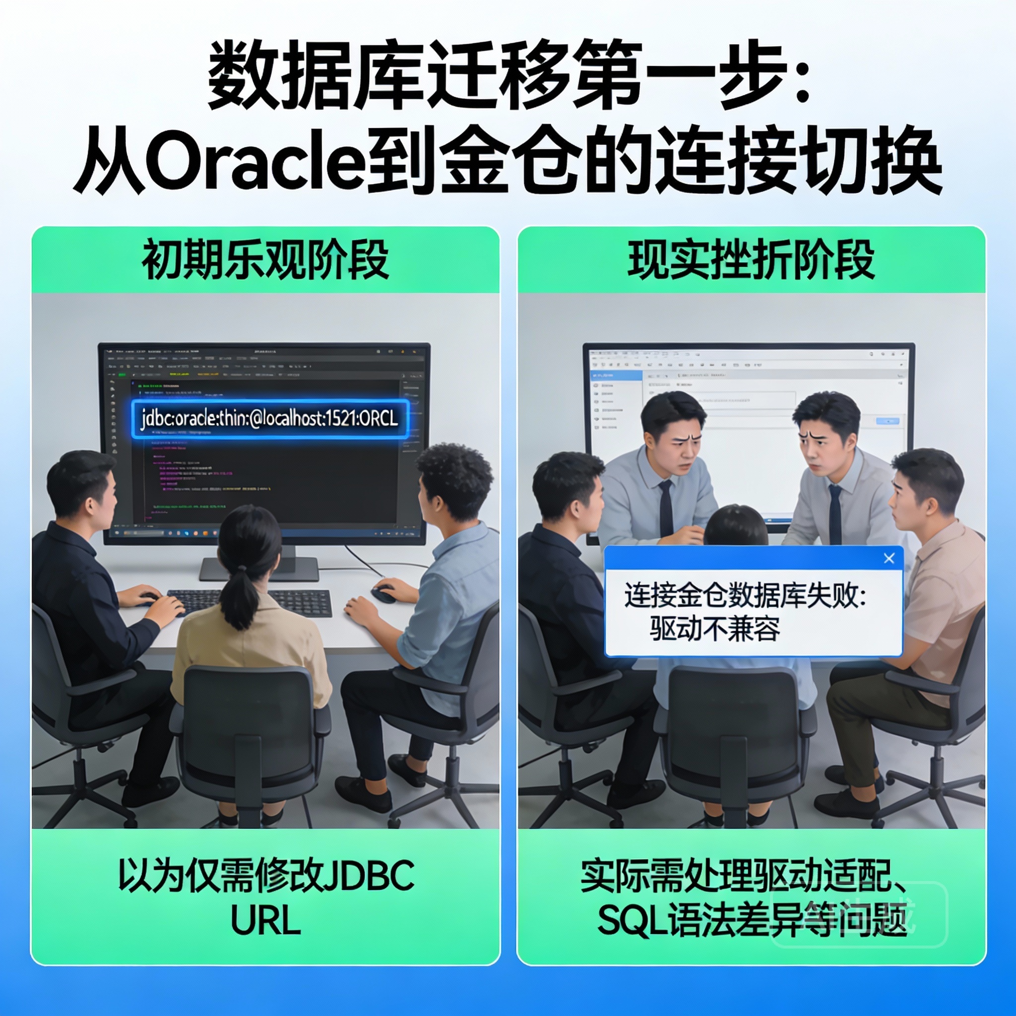 大多数迁移项目的第一步,就是把应用的连接从 Oracle 换到金仓。很多团队一开始都很乐观,以为改个 JDBC URL 就行,但现实通常会给你当头一棒。