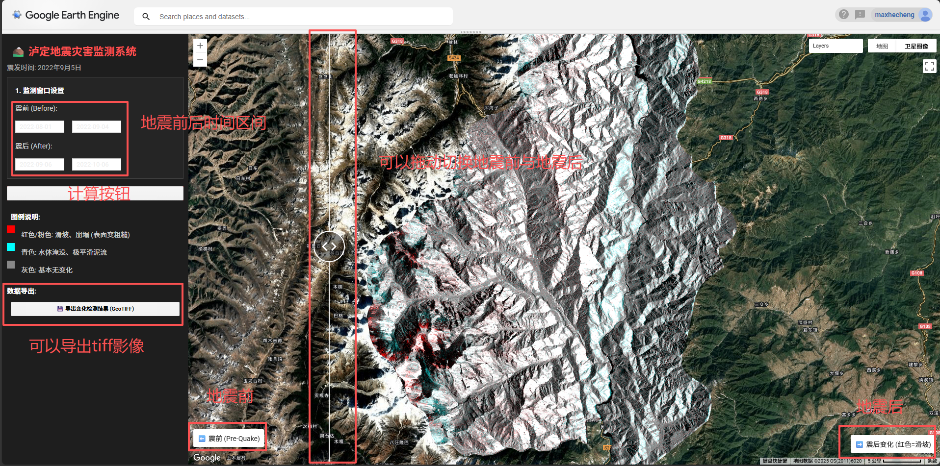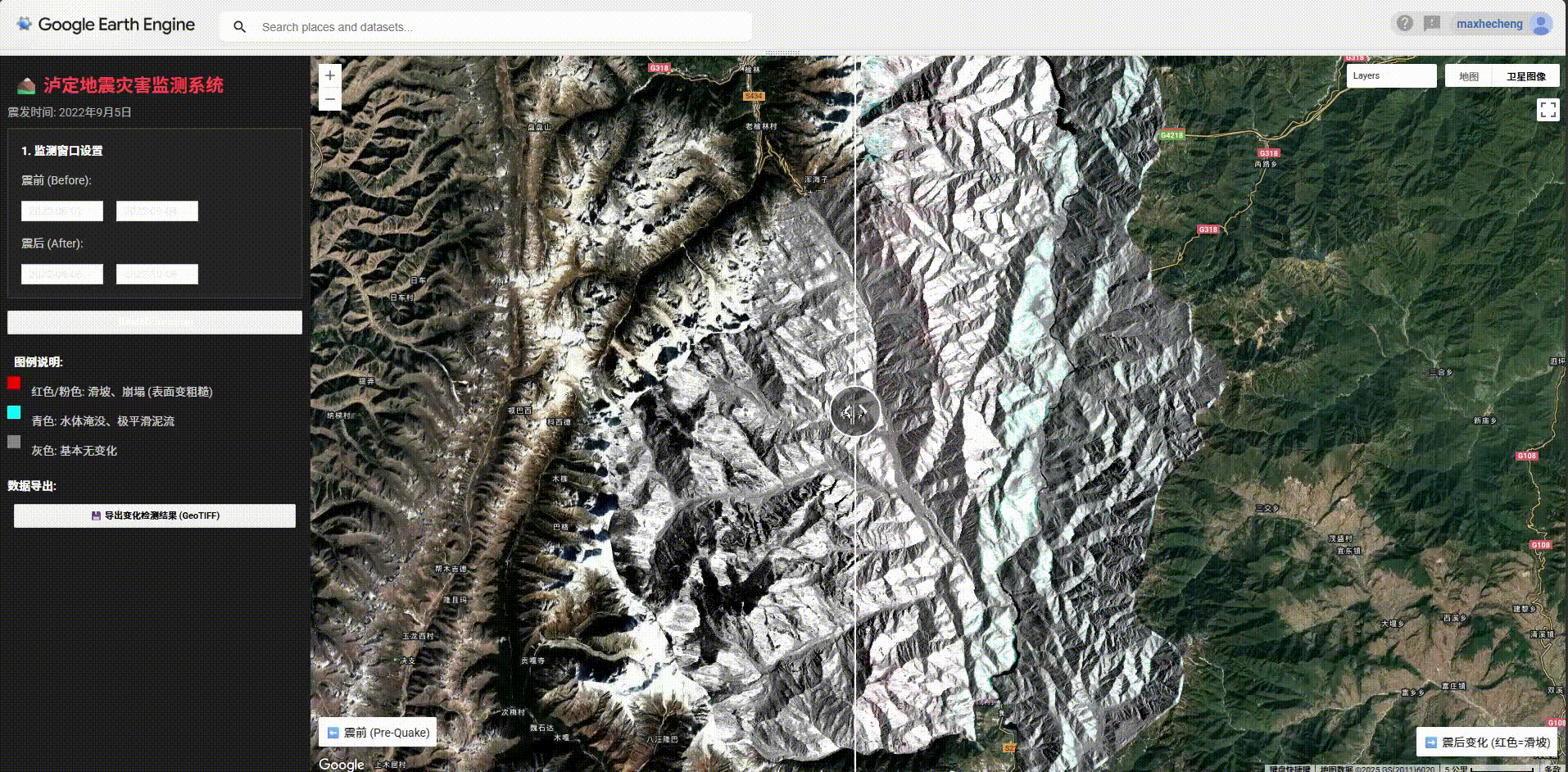 - 集成交互式卷帘工具,左侧显示震前 (Pre-event) 影像,右侧显示震后 (Post-event) 变化合成影像,支持毫秒级同步拖动对比。