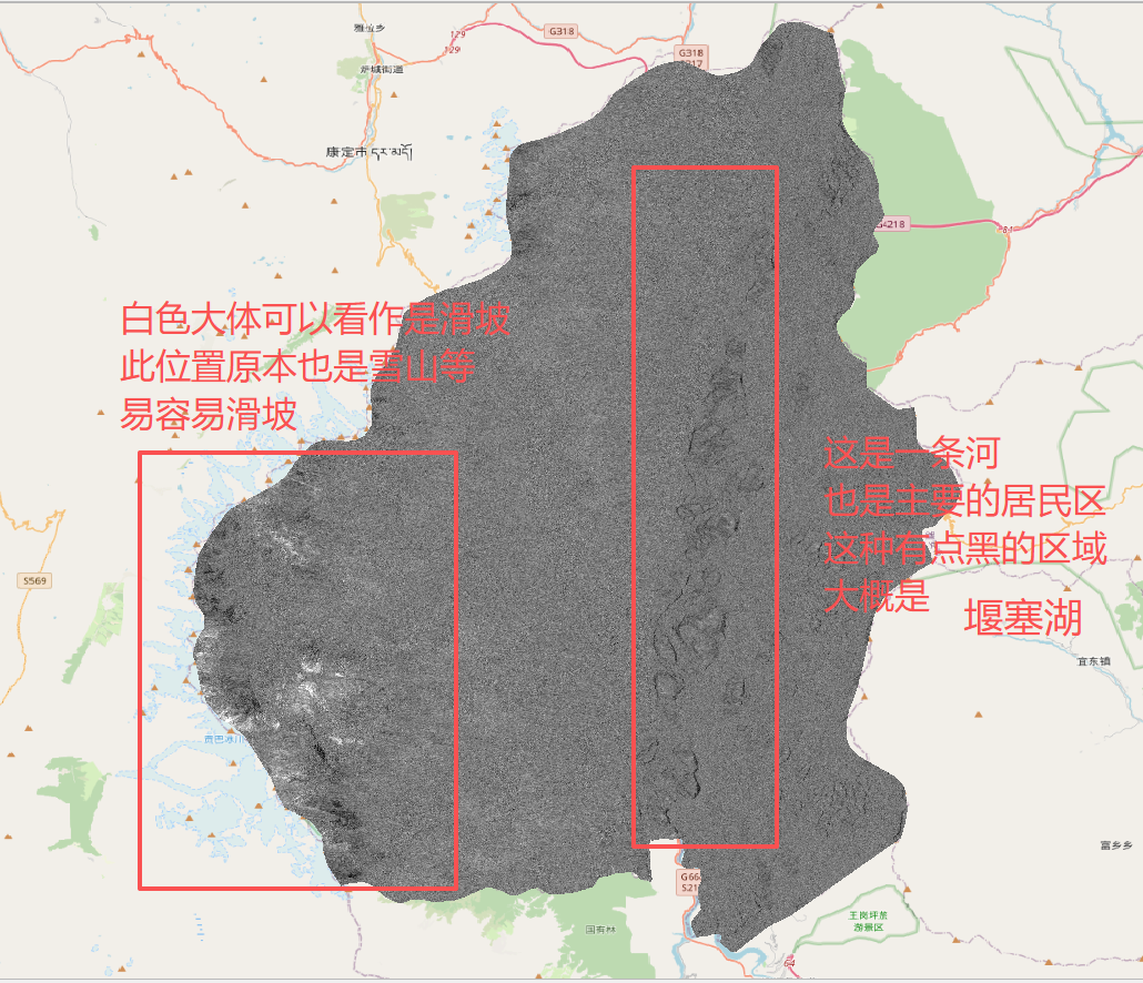 - 原因:原本是陆地或植被的区域被水淹没(水体发生镜面反射,回波极低),或者是形成了极为平滑的泥流。