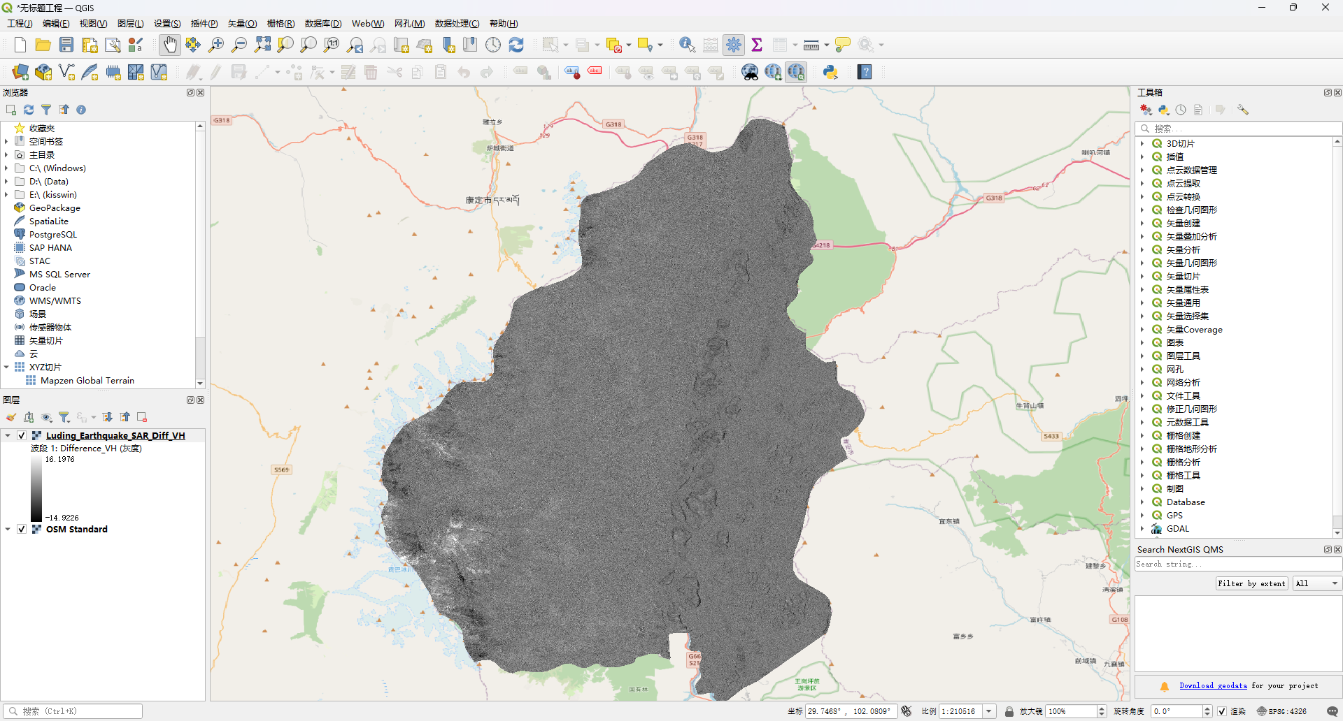 当前配置专门针对 2022年9月5日四川泸定 6.8 级地震。由于地震发生在多云雾的高山峡谷地区,光学卫星(如 Landsat/Sentinel-2)往往受云层遮挡无法及时获取影像,而 SAR 雷达影像具有穿透云雾的能力,是第一时间监测地震诱发滑坡(Landslides)、崩塌(Collapse)及堰塞湖的理想工具。