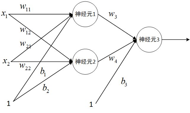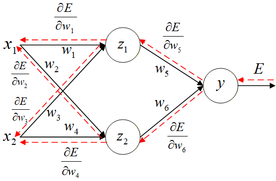 z 1 = σ ( w 1 x 1 + w 3 x 2 ) z 2 = σ ( w 2 x 1 + w 4 x 2 ) y = σ ( w 5 a 1 + w 6 a 2 ) z_1 = \sigma{(w_1x_1+w_3x_2)}\\ z_2 = \sigma{(w_2x_1+w_4x_2)}\\ y = \sigma{(w_5a_1+w_6a_2)} z1=σ(w1x1+w3x2)z2=σ(w2x1+w4x2)y=σ(w5a1+w6a2)