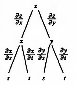 多元复合函数求导一般比较复杂,为了便于记忆链式法则,可以按照各变量间的复合关系,画成如下树状图。首先,从因变量 z z z向中间变量 x x x, y y y画两个分支,然后再分别从中间变量 x x x, y y y向自变量 s s s, t t t画分支,并在每个分支旁边写上对应的偏导数。求 ∂ z ∂ s \frac{\partial z}{\partial s} ∂s∂z时,只需要把从 z z z到 s s s的每个路径上的偏导数相乘,然后再将这些乘积相加即得:
