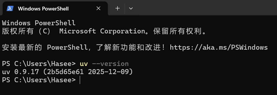 powershell# 安装最新版本 powershell -ExecutionPolicy ByPass -c "irm https://astral.sh/uv/install.ps1 | iex" # 安装指定版本(如 0.9.17) powershell -ExecutionPolicy ByPass -c "irm https://astral.sh/uv/0.9.17/install.ps1 | iex"