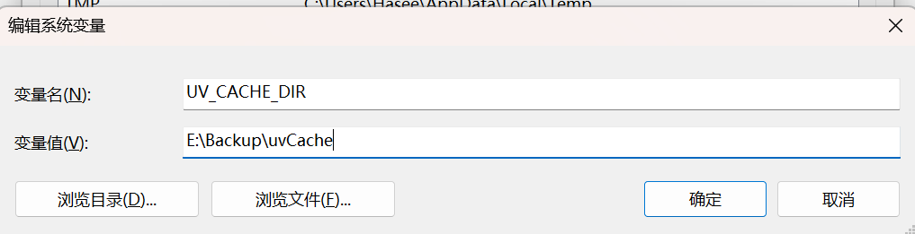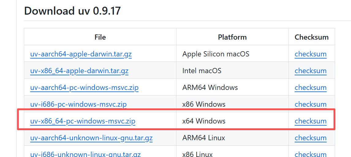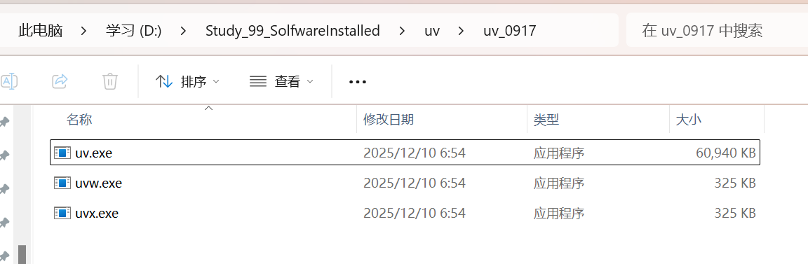 从 GitHub 下载对应平台的压缩包 ,解压后得到 uv.exe、uvw.exe、uvx.exe,将文件路径添加到系统环境变量 PATH 即可。