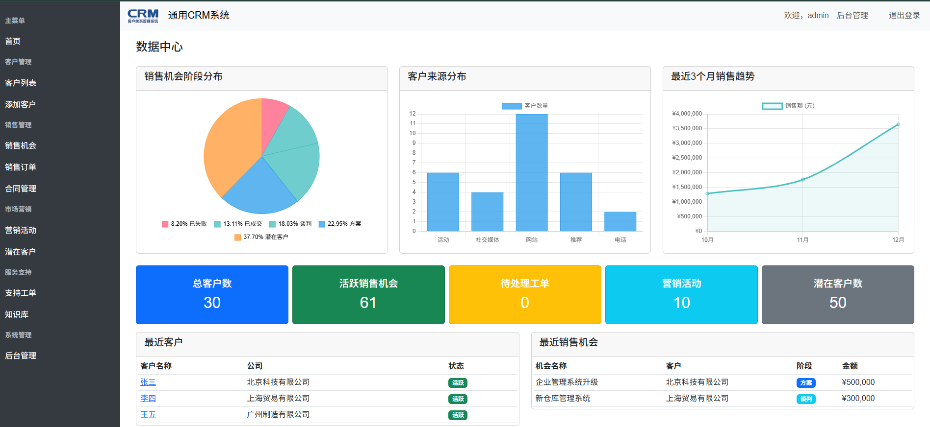 **可视化图表**:销售趋势、客户来源分布、销售机会阶段分布