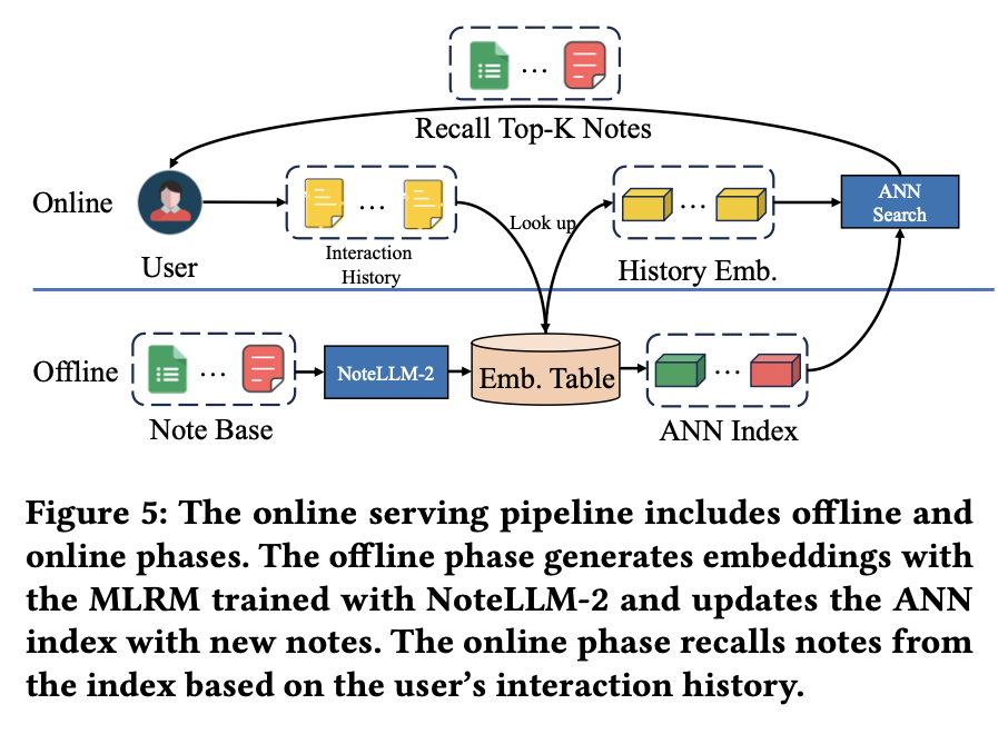图5展示了在线服务流程,分为离线与在线两个阶段。离线阶段中,经NoteLLM-2训练的多模态关系模型(MLRM)会实时生成用户新发布笔记的多模态嵌入向量,这些向量存入嵌入表以供复用。同时,基于物品相似度的近似最近邻(I2I ANN)索引会动态更新新笔记的嵌入向量。
