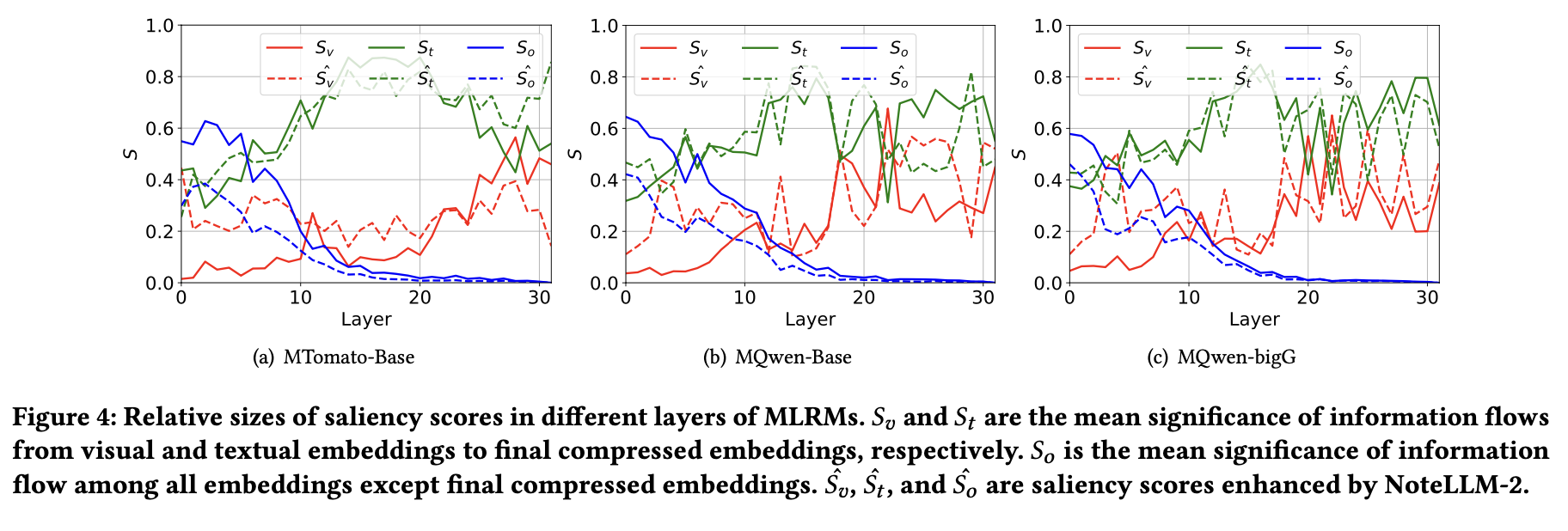 为深入理解NoteLLM-2对多模态语言表示模型(MLRM)的影响,对比了原始微调方法与增强微调方法的显著性分数差异。原始方法的显著性分数为𝑆𝑣(视觉)、𝑆𝑡(文本)和ˆ 𝑆𝑜(其他模态),而增强方法的分数为𝑆^𝑣、𝑆ˆ𝑡和𝑆ˆ𝑜。其中,视觉笔记压缩词被纳入视觉嵌入𝐸𝑣的一部分。