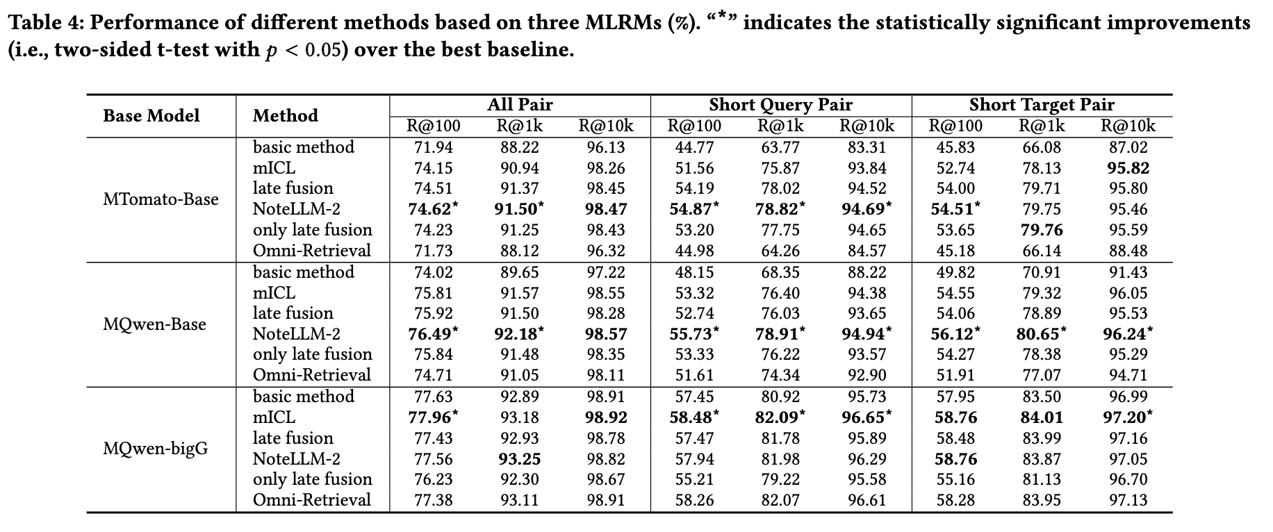 基于三种多模态语言检索模型(ML-RM),通过以下基线实验验证NoteLLM-2的有效性: