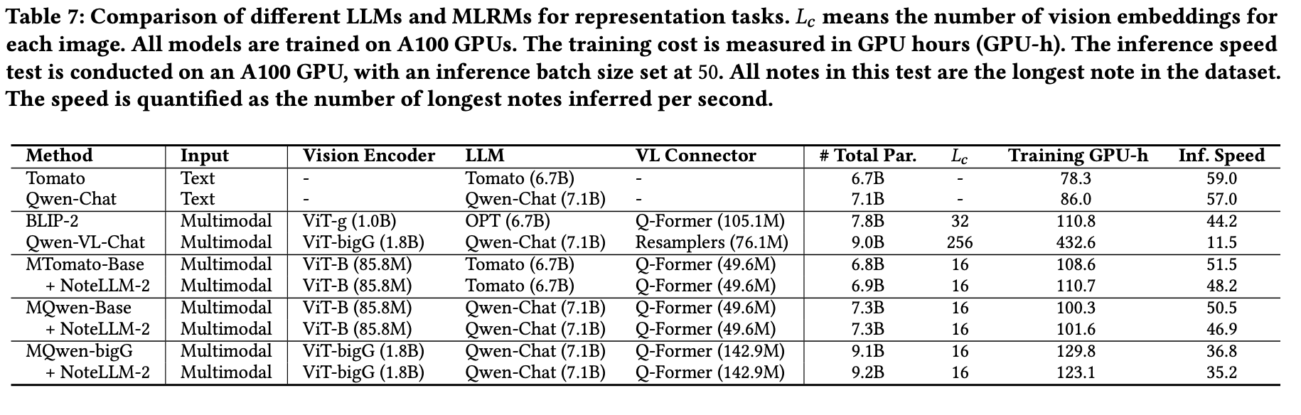 由于NoteLLM-2采用了更长的提示模板,其集成通常会轻微降低训练和推理速度,但能带来更好的性能表现。
