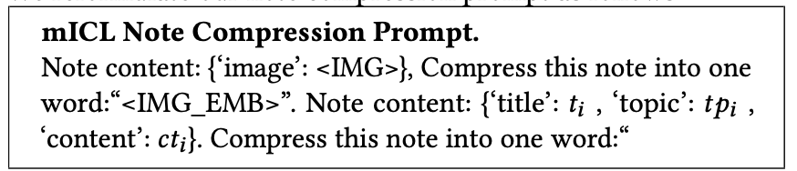 具体实现上,给定笔记 ( n_i ),mICL 不再将多模态信息压缩为单一词汇,而是拆分为单模态笔记,并采用类似上下文学习(ICL)的方式聚合多模态信息。笔记压缩提示模板重构如下: