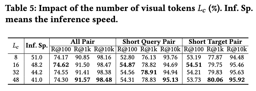 通过调整视觉标记长度探究其影响,结果如表5所示。将长度从16降至8会导致性能下降,但推理效率更高。视觉标记长度在性能与推理速度之间存在权衡。此外,表2数据显示,**即使仅使用8个视觉标记,MTomato-Base+NoteLLM-2的性能仍优于使用16个视觉标记的MTomato-Base。**这表明本方法通过改进注意力模式与融合机制增强了视觉注意力,而非单纯扩展图像标记空间。