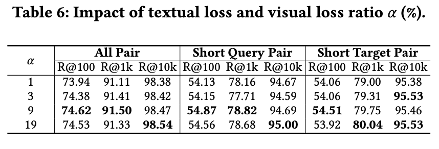 调整文本与视觉损失比例𝛼的结果如表6所示。当比例较小时,性能略差;但随着比例增加,本方法对文本与视觉损失比例的变化表现出较强的鲁棒性。