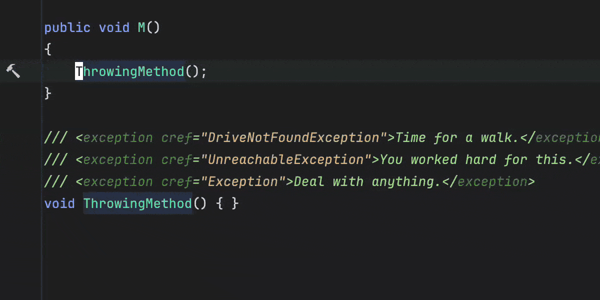 Rider 2025.3 引入了新的 Generate try-catch block(生成 try-catch 块)上下文操作,该操作可以根据 XML 文档自动为方法调用生成 try-catch 块,帮助您以更快的速度和更高的一致性处理声明的异常。