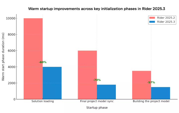 Rider 2025.3 在启动性能和总体响应能力方面实现了显著提升, 多个内部初始化阶段得到优化,缩短了解决方案总加载时间,让 IDE 能够更快地做好工作准备。