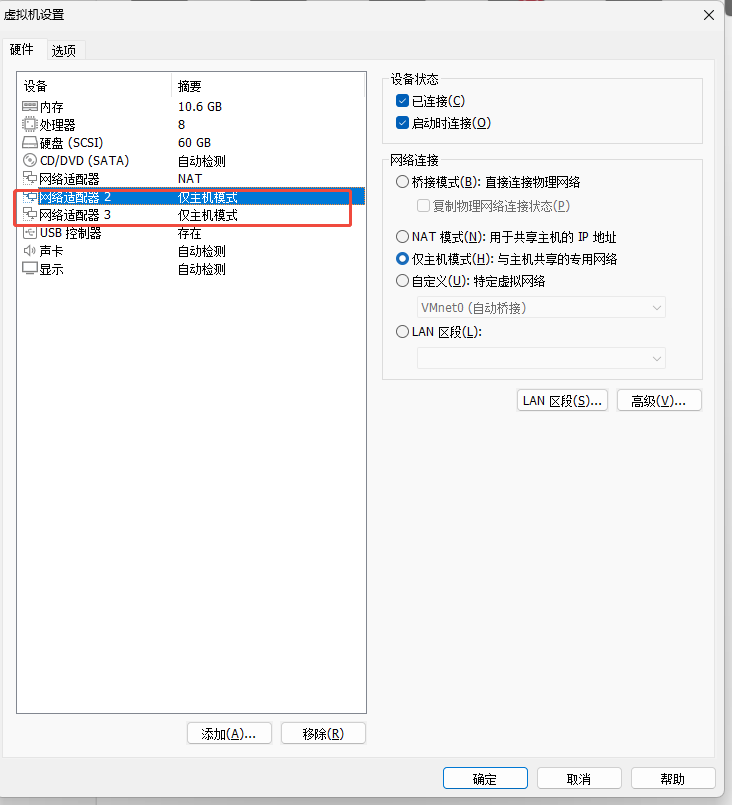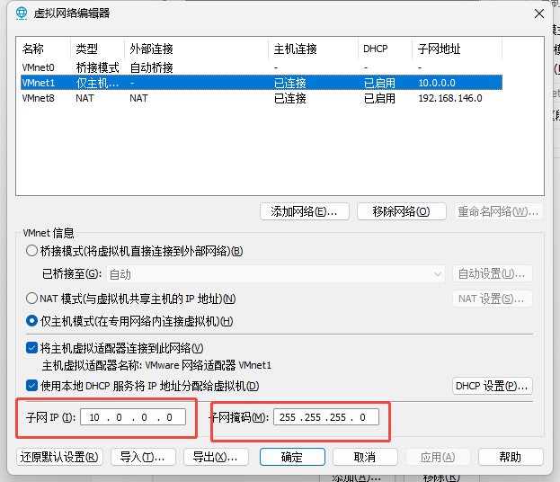 - 在VMware配置主机模式,网段为:10.0.0.0/24