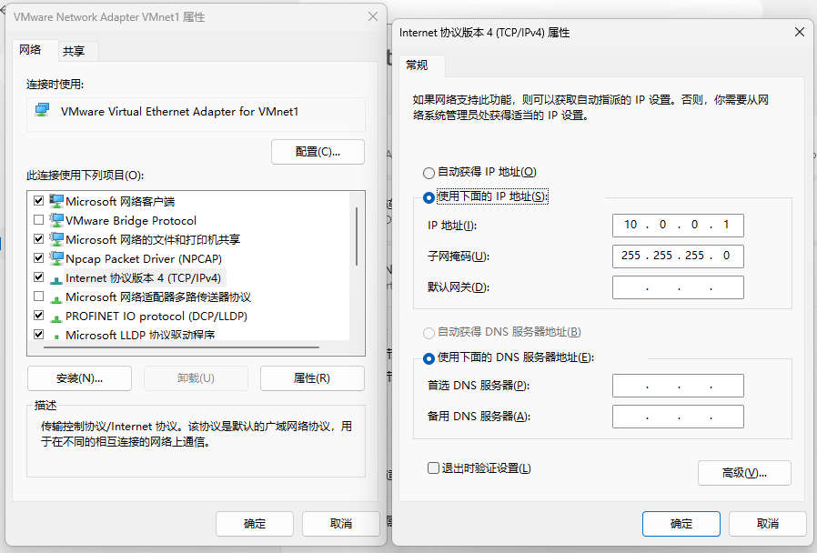 设置Windows主机的VMware网卡(VMnet)的IP地址:10.0.0.1(手动配置)