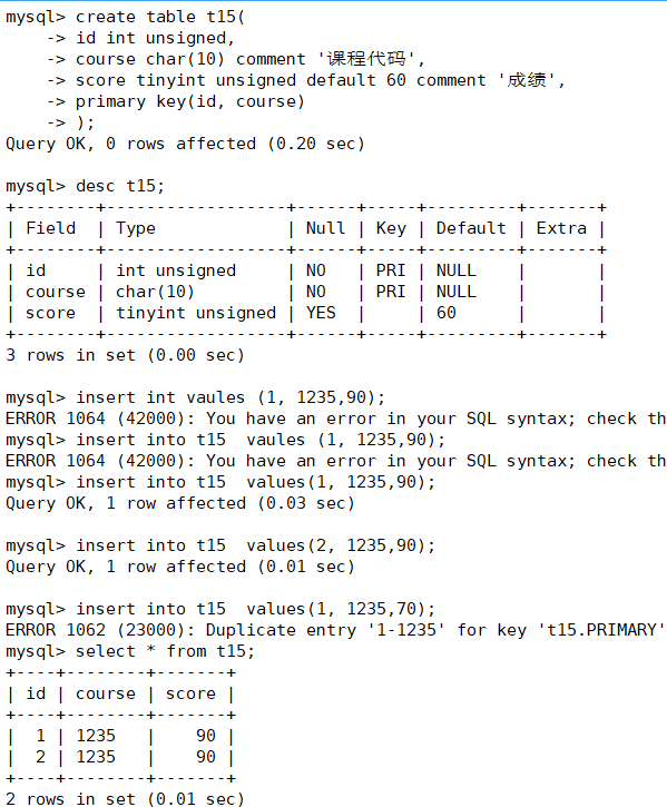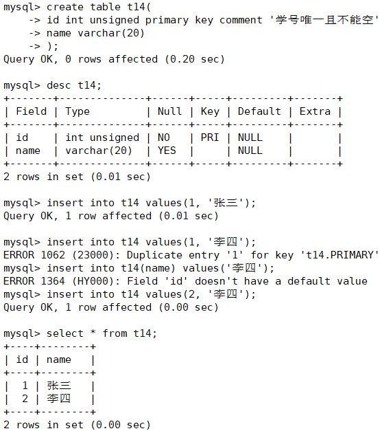 注:主键虽然只能有一个,但可以修饰多列,这样的主键被成为复合主键