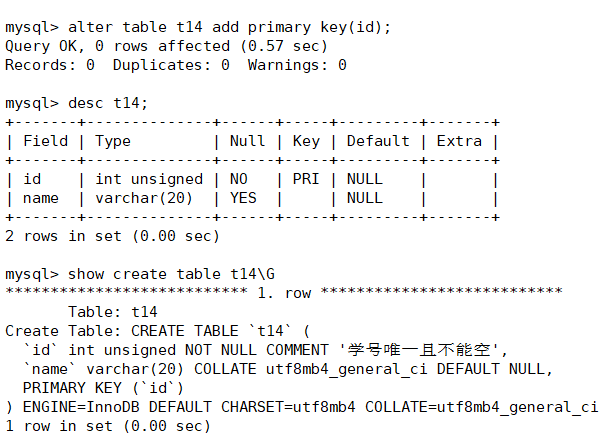 当然,show create table命令让我们看到了MySQL主键的创建方式;