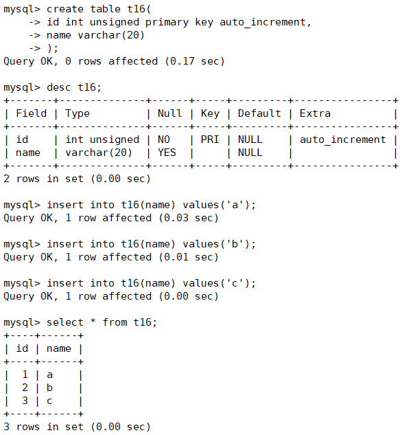 auto_increment:修饰的字段,不给值,会自动的被系统触发,系统会从当前字段中已经有的最大值+1操作,得到一个新的不同的值。通常和主键搭配使用,作为逻辑主键。