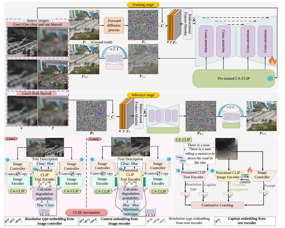 引入CLSE机制与CA-CLIP模型,自适应感知图像清晰度并提取语义信息,为融合提供精准语义引导。