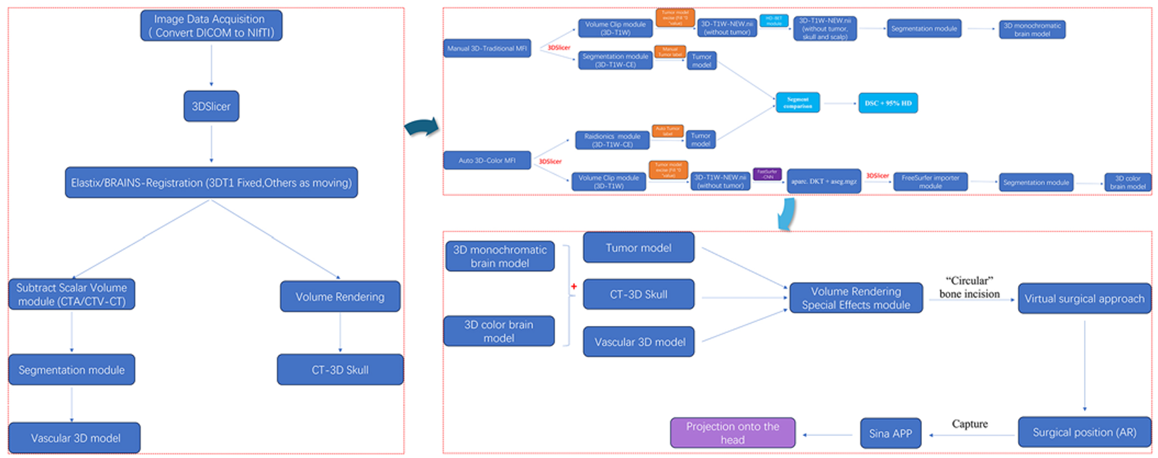 整合开源AI工具(FastSurfer、Raidionics-Slicer)与AR技术,构建快速3D彩色多模态图像融合工作流,替代传统单色融合方式。