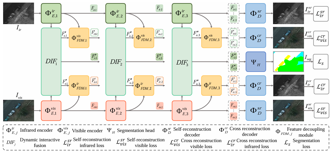 **方法:**论文提出 FreeFusion 方法,通过跨重建学习解耦融合特征以实现源图像跨模态重建,结合动态交互融合策略构建融合特征与目标语义特征的相关矩阵并强化强相关特征,实现红外与可见光多模态图像的自适应互补信息融合,同时提升下游分割和检测任务性能。