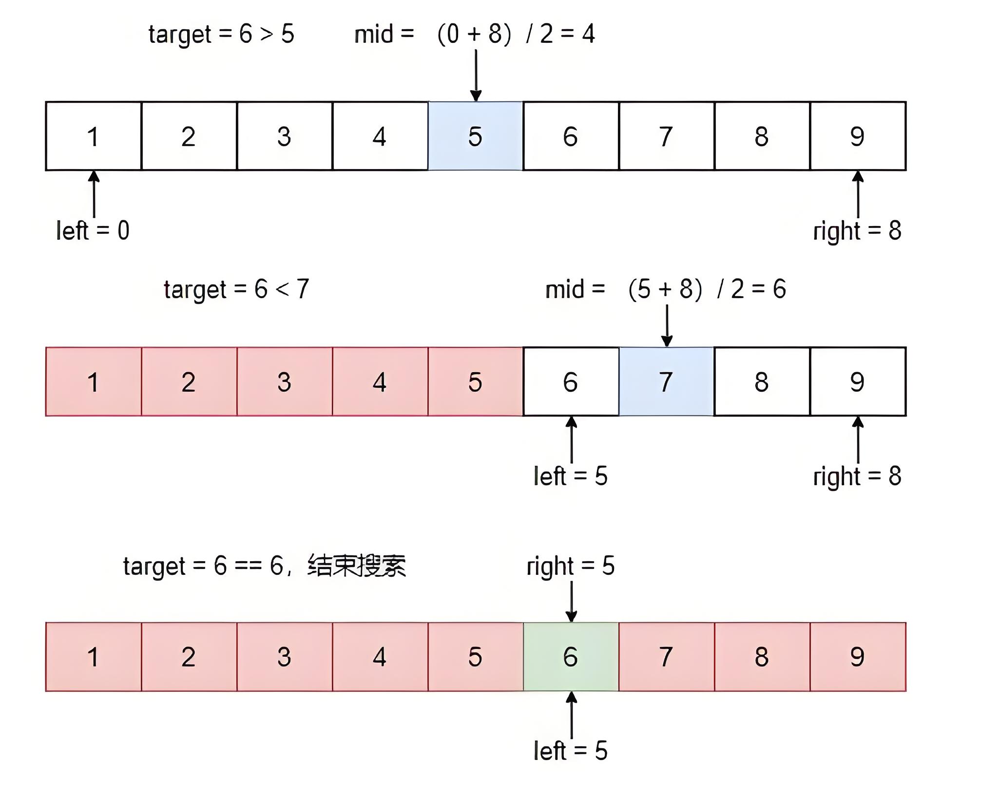 arr[mid]等于target,则搜索成功,返回mid位置。 - 如果