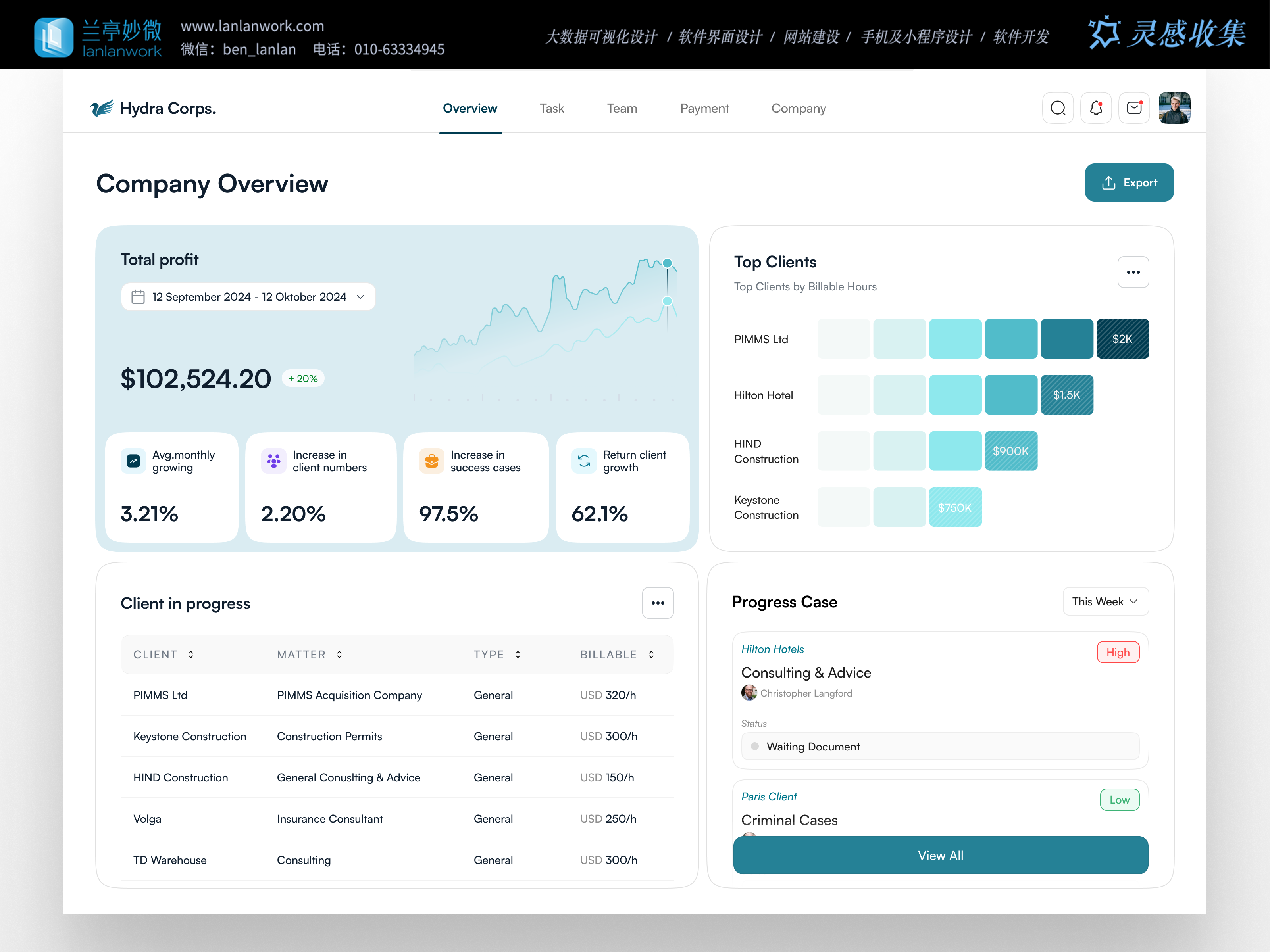 北京兰亭妙微曾对企业管理者做过行为调研:传统管理系统需要用户在 6 个以上的页面切换,才能完成 "查看总利润→分析客户贡献→了解项目进展" 的流程,而 Hydra Corps. 将其压缩到 "同一界面内的信息串联",决策路径缩短了近 70%。"好的企业布局,是让用户'不用找信息,信息就在决策的下一个环节里'",北京兰亭妙微的设计师这样总结 ------ 比如 "Top Clients" 模块与 "Client in progress" 模块的相邻布局,恰好匹配管理者 "从核心客户到在途项目" 的关联思考,让决策逻辑无缝衔接。