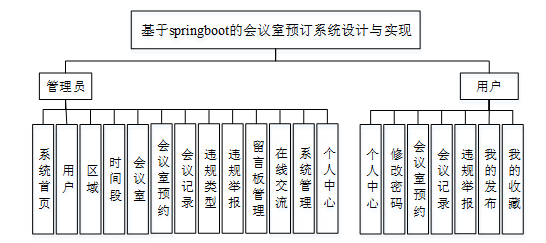 会议室预订系统在设计与实现时,采取了模块性的设计理念,把相似的系统的功能整合到一个模组中,以增强内部的功能,减少各组件之间的联系,从而达到减少相互影响的目的。系统总体功能结构如图4-1所示。