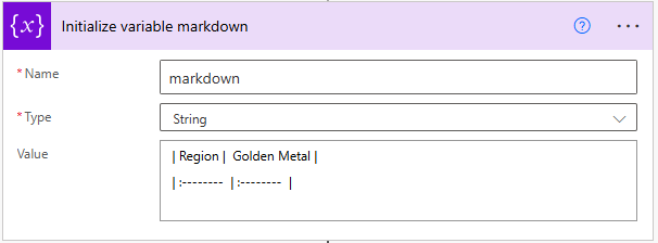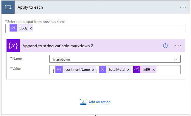 使用Apply to each 对Parse Json生成的结果进行遍历,然后以markdown的形式append到markdown变量中,