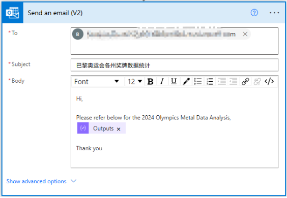 7)添加Send email action,如下图所示,将Compose的output添加到邮件正文中,