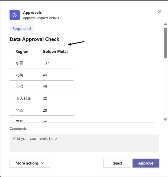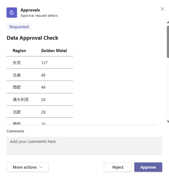 启动工作流,在MS Teams的Approvals中会看到如下包含了table的审批请求,