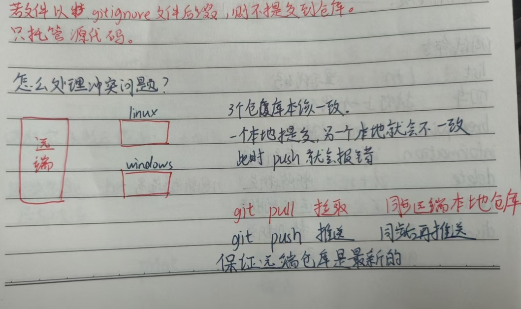 推送前:本地要基于「远端最新版本」开发(避免覆盖他人代码),需先 git pull 拉取远端更新,解决冲突后再推送