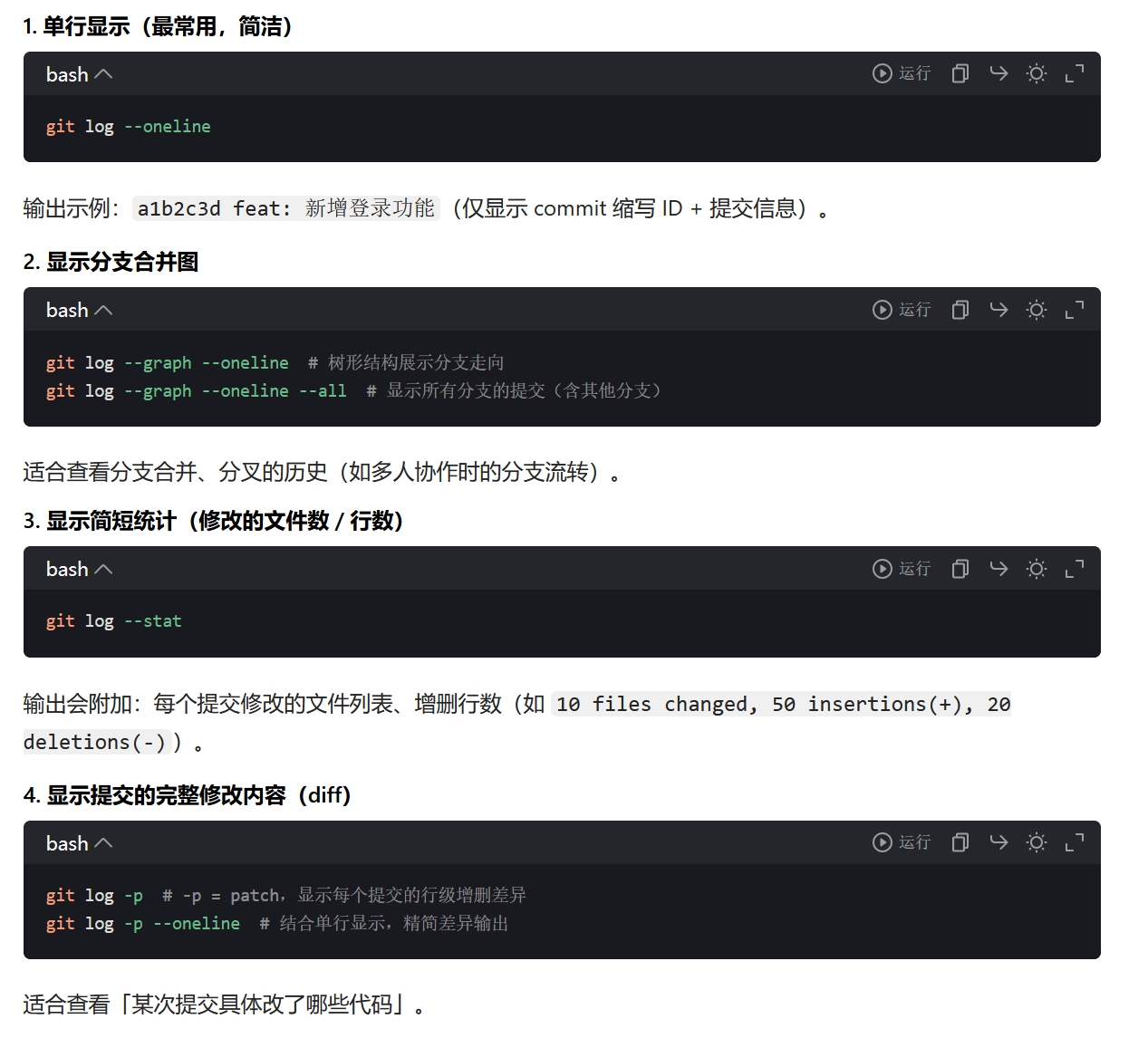 默认输出:按提交时间倒序显示所有提交,每条包含: