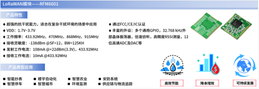 在传输性能方面 ,RFM6601搭载完整LoRaWAN协议栈,可自定义扩频因子与带宽,实现数公里乃至更大范围的远距离通信能力,并能轻松跨越各种复杂环境;