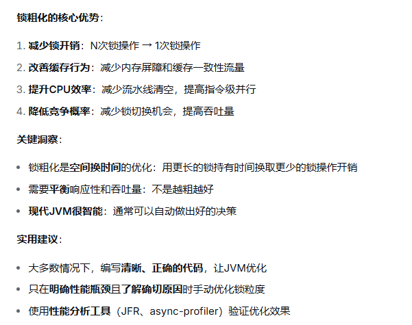 锁粗化是对于一个线程中多个连续的逻辑对其进行加锁解锁,从而将这些连续的逻辑的多次加锁解锁步骤将其合并为一个大的逻辑只对这个大的逻辑进行一次加锁和一次解锁